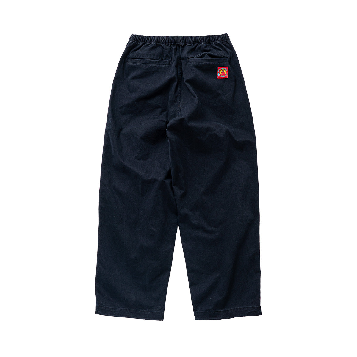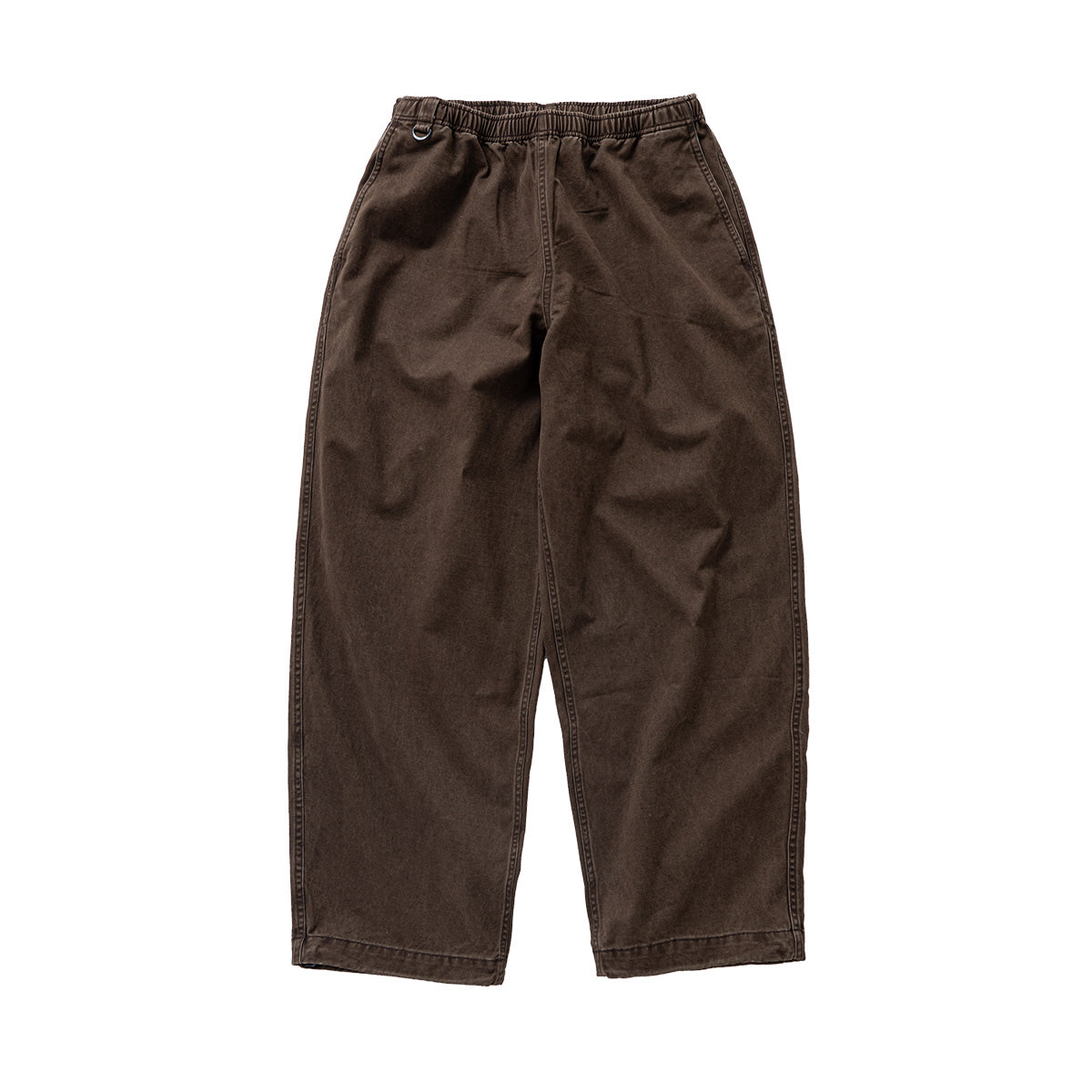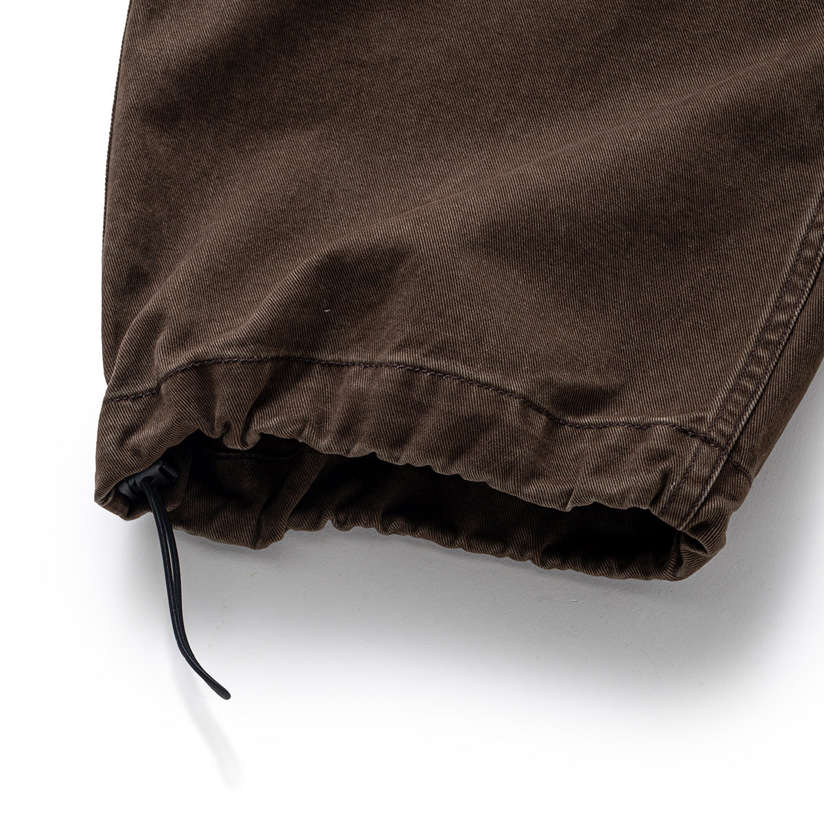 裾を絞れるパラシュートパンツのディテールを採用したリラックス感のあるパンツ。赤い織りネームがヒップポケット部にあしらわれたシンプルな構成で、合わせるアイテムに困ることはありませんが、同生地のワークジャケットと組み合わせたセットアップが特にオススメ。