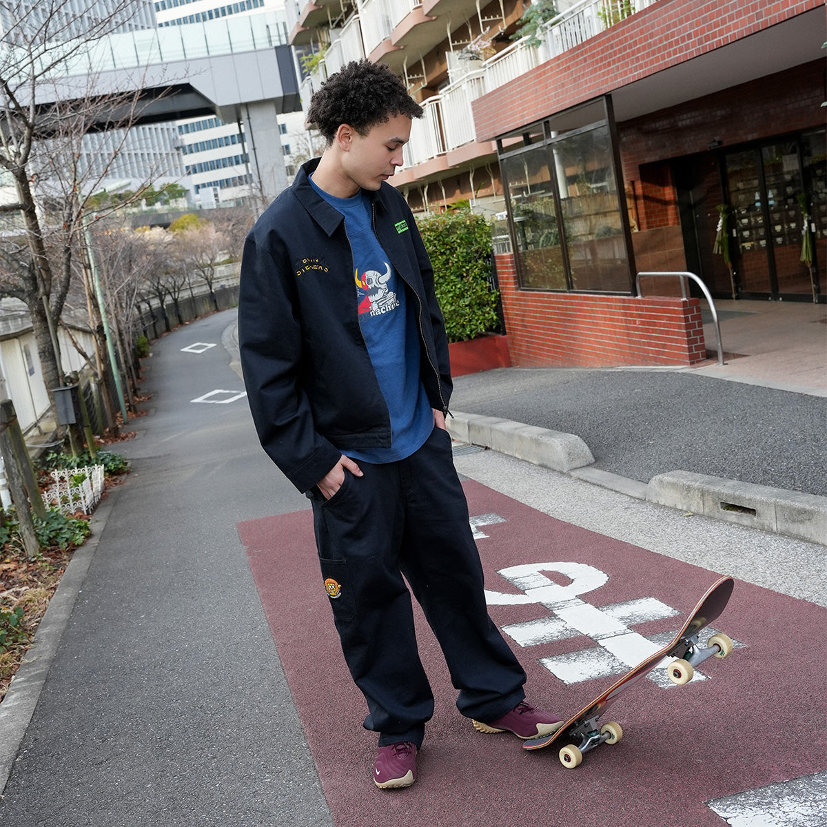 ワークジャケットをベースにトイマらしい刺繍やパッチをあしらったユニークな1着。インパクト抜群の背面デザインだがバランスよくまとめてあるので、いつものスタイリングにも自然とハマってくれる。リンクしたデザインのカーペンターパンツと合わせたセットアップも◎。